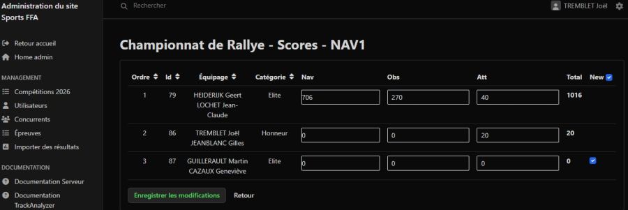 Si un concurrent n'a pas encore de résultats, une chexkbox s'affiche à l'extrémité droite. Si cette option est cochée alors les pénalités de la ligne seront inscrites dans la base de données une fois que vous validerez Enregistrer les modifications.